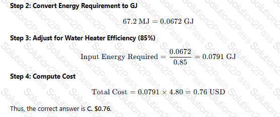 Natural gas costs $4.80/GJ. How much does it cost to heat 500 liters of water from 18°C to 50°C using a natural gas water heater with an efficiency of 85%? [The efficiency and fuel price are both based on HHV. The specific heat of water (C) is 4.2 kJ/kg-°C.]