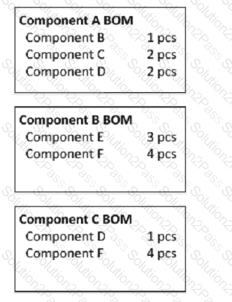 Given the bill of material (BOM) information below and independent requirements of 10 pieces (pcs) per week of Component A and 20 pieces (pcs) per week of Component B, what is the weekly gross requirement of component F?