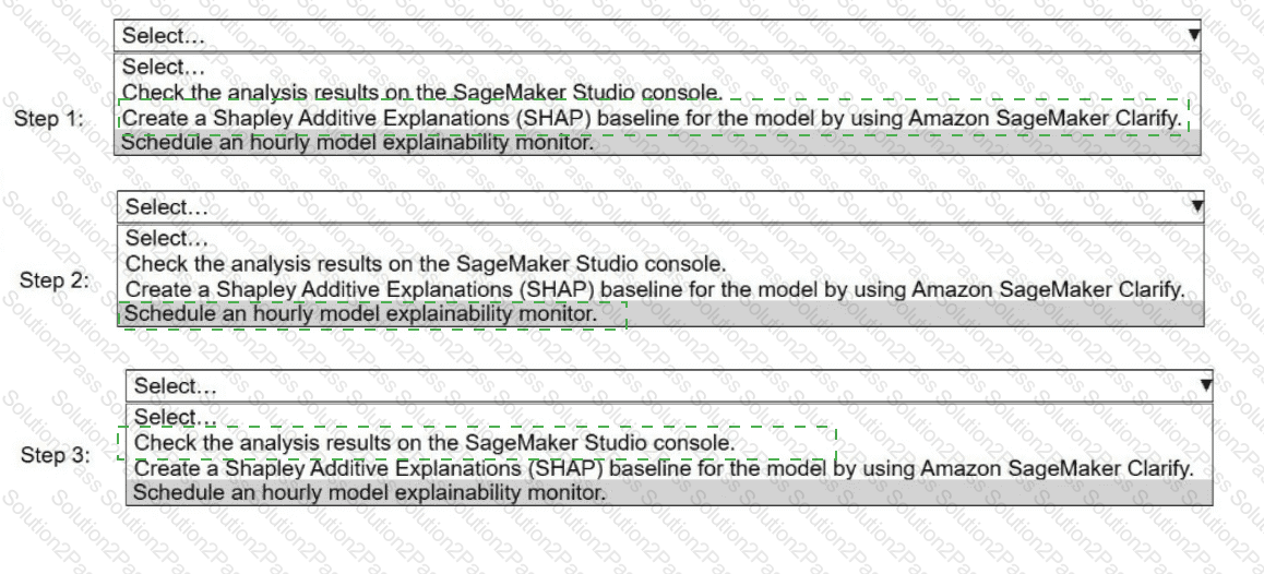 A company has deployed a model to predict the churn rate for its games by using Amazon SageMaker Studio. After the model is deployed, the company must monitor the model performance for data drift and inspect the report. Select and order the correct steps from the following list to model monitor actions. Select each step one time. (Select and order THREE.) .
