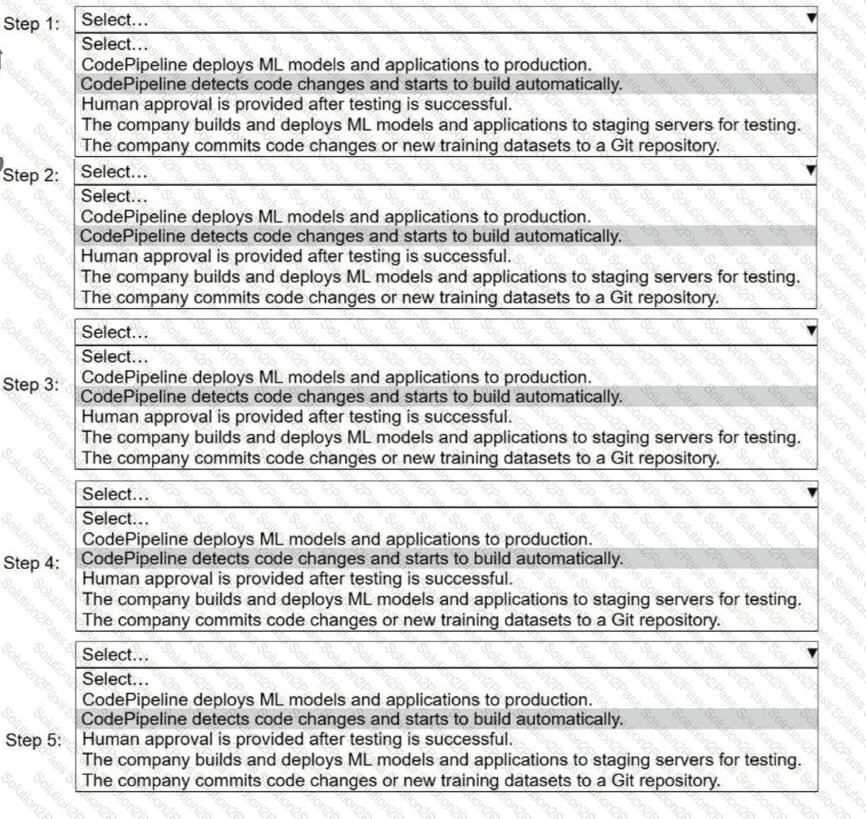 A company uses AWS CodePipeline to orchestrate a continuous integration and continuous delivery (CI/CD) pipeline for ML models and applications.