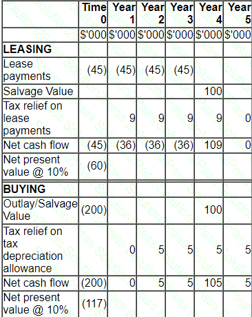 A company plans a four-year project which will be financed by either an operating lease or a bank loan.