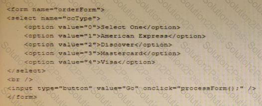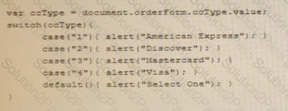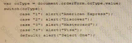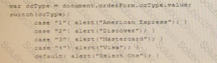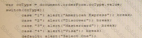 Ginger needs to write a script to display a pop-up alert box with the type of credit card the user selected Which of the following code blocks should she use?