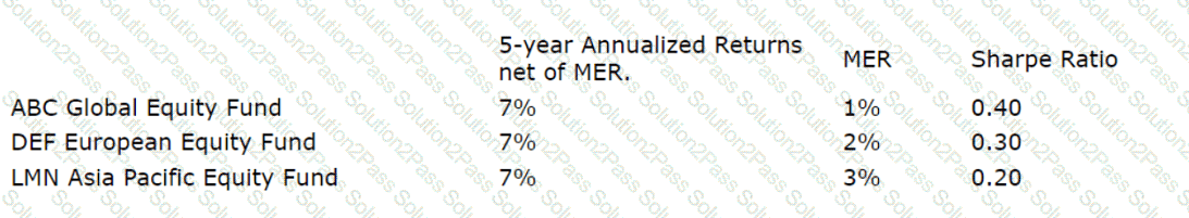 Danny is a Dealing Representative for Everbright Investments. He met with his client Adele, who has $1,000,000 to invest. During their meeting Danny determines that Adele has a high-risk profile. In addition, he learns that she has an excellent understanding of equities and how volatile they can be. Danny is considering recommending growth funds specifically, and making a recommendation from the following investment options: