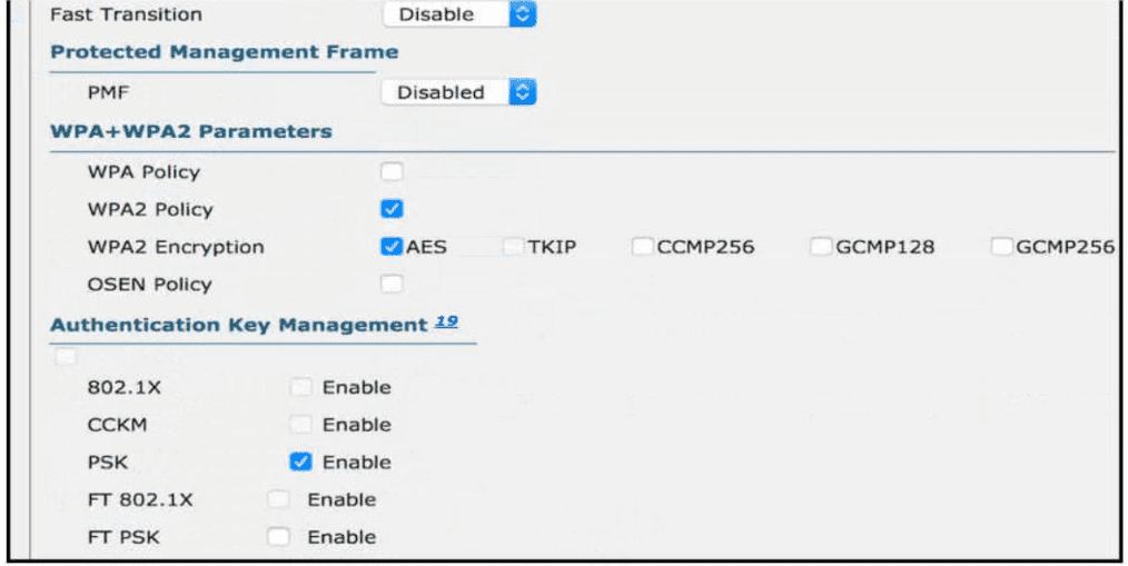 Users need to connect to the wireless network with IEEE 802. 11r-compatible devices. The connection must be maintained as users travel between floors or to other areas in the building What must be the configuration of the connection?