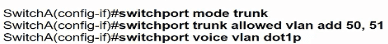 Switch A is newly configured. All VLANs are present in the VLAN database. The IP phone and PC A on Gi0/1 must be configured for the appropriate VLANs to establish connectivity between the PCs. Which command set fulfills the requirement?