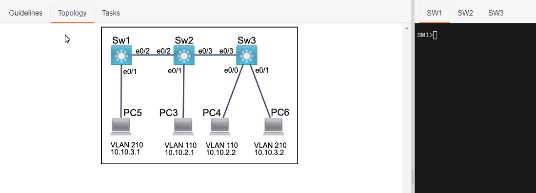 2. Configure the e0/2 interfaces on Sw1 and Sw2 as 802.1q trunks with only the required VLANs permitted.