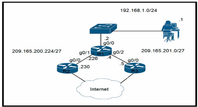 Router R1 currently is configured to use R3 as the primary route to the Internet, and the route uses the default administrative distance settings. A network engineer must configure R1 so that it uses R2 as a backup, but only if R3 goes down. Which command must the engineer configure on R1 so that it correctly uses R2 as a backup route, without changing the administrative distance configuration on the link to R3?