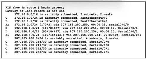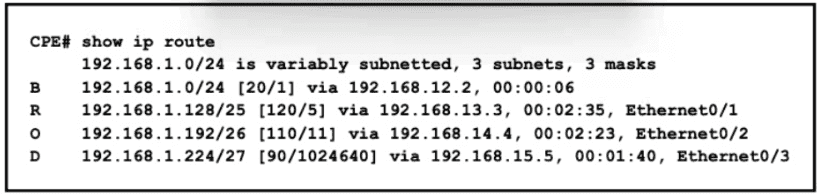 All traffic enters the CPE router from interface Serial0/3 with an IP address of 192 168 50 1 Web traffic from the WAN is destined for a LAN network where servers are load-balanced An IP packet with a destination address of the HTTP virtual IP of 192 1681 250 must be forwarded Which routing table entry does the router use?