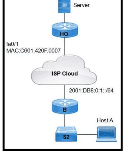 An engineer is configuring the HO router. Which IPv6 address configuration must be applied to the router fa0'1 interface for the router to assign a unique 64-brt IPv6 address to Itself?