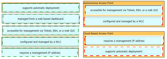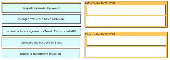 Drag and drop the facts about wireless architectures from the left onto the types of access point on the right. Not all options are used.