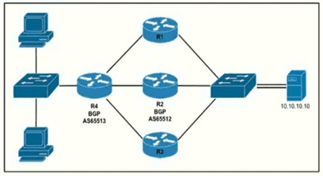 Router R4 is dynamically learning the path to the server. If R4 is connected to R1 via OSPF Area 20, to R2 v2ia R2 BGP, and to R3 via EIGRP 777, which path is installed in the routing table of R4?