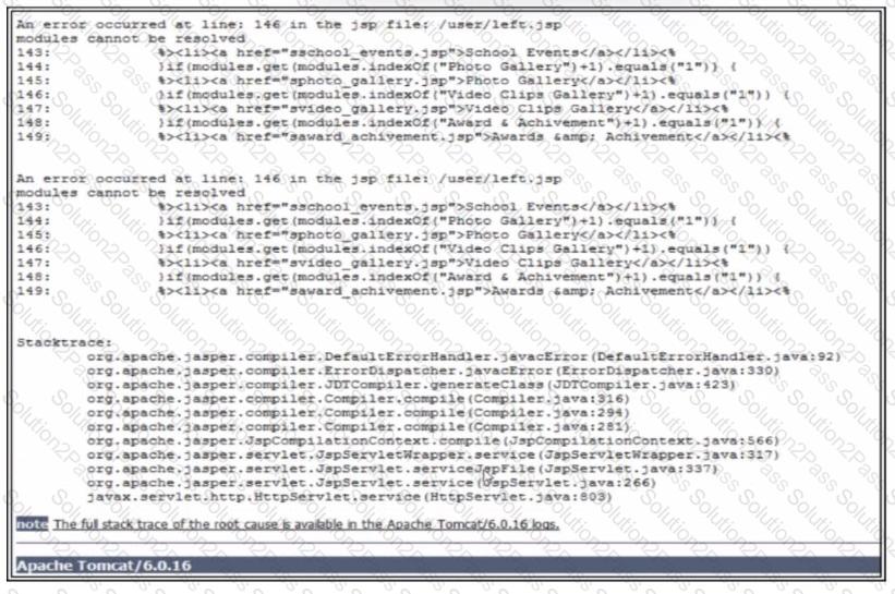 Refer to the exhibit. A penetration test performed against a web application generates the error message. Which two pieces of information are exposed? (Choose two.) Q Internal paths of the web server