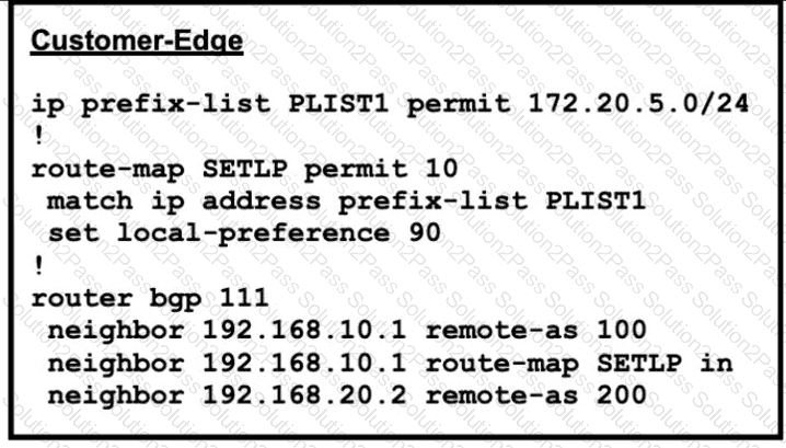 AS 111 wanted to use AS 200 as the preferred path for 172.20.5.0/24 and AS 100 as the backup. After the configuration, AS 100 is not used for any other routes. Which configuration resolves the issue?