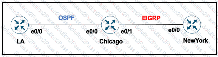 The network administrator must mutually redistribute routes at the Chicago router to the LA and NewYork routers. The configuration of the Chicago router is this:
