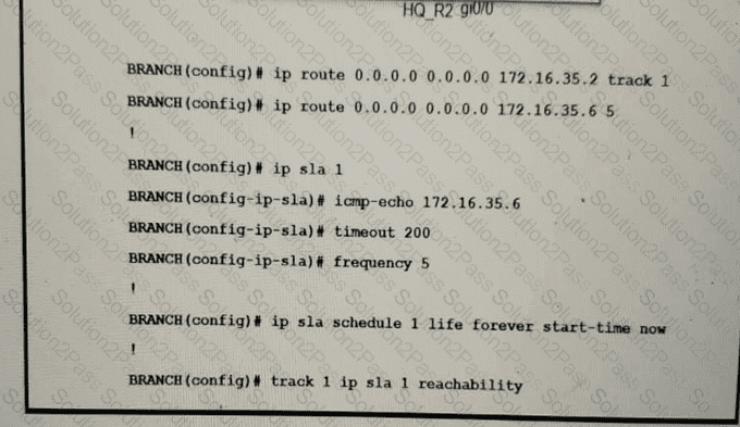 Traffic from the branch network should route through HQ R1 unless the path is unavailable. An engineer tests this functionality by shutting down interface on the BRANCH router toward HQ_R1 router but 192.168.20.0/24 is no longer reachable from the branch router. Which set of configurations resolves the issue?