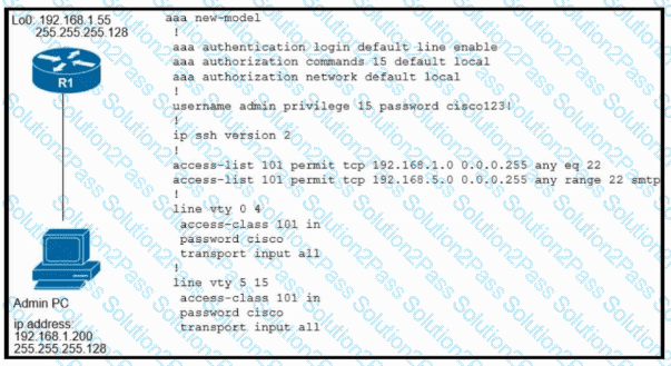 A network administrator cannot connect to a device via SSH. The line vty configuration is as follows: