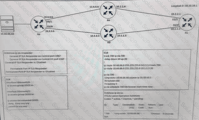R1 is configured with IP SLA to check the availability of the server behind R6 but it kept failing. Which configuration resolves the issue?