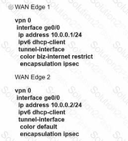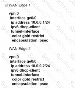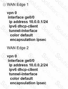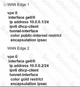 An engineer must configure two branch WAN Edge devices where an Internet connection is available and the controllers are in the headquarters. The requirement is to have IPsec VPN tunnels established between the same colors. Which configuration meets the requirement on both WAN Edge devices?