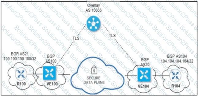 An engineer configured OMP with an overlay-as of 10666. What is the AS-PATH for prefix 104.104.104.104/32 on R100?