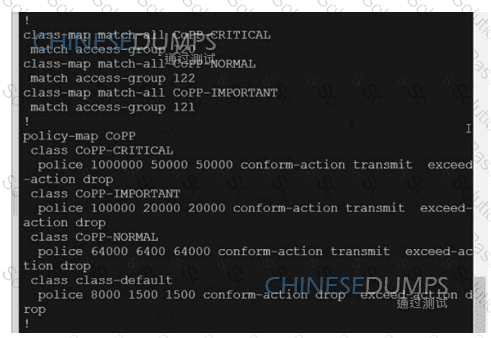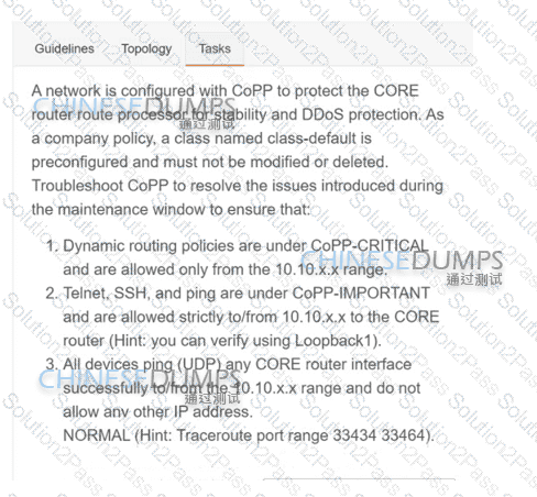 A network is configured with CoPP to protect the CORE router route processor for stability and DDoS protection. As a company policy, a class named class-default is preconfigured and must not be modified or deleted. Troubleshoot CoPP to resolve the issues introduced during the maintenance window to ensure that: