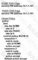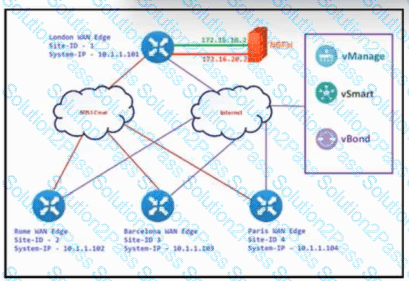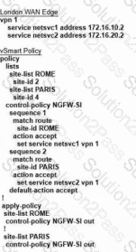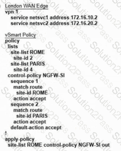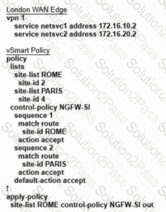 Refer to the exhibit. The Cisco SD-WAN is deployed using the default topology. The engineer wants to configure a service insertion policy such that all data traffic between Rome to Paris is forwarded through the NGFW located in London. Which configuration fulfills this requirement, assuming that the Service VPN ID is 1?