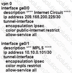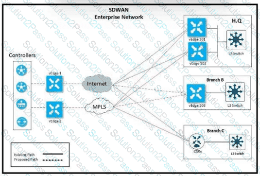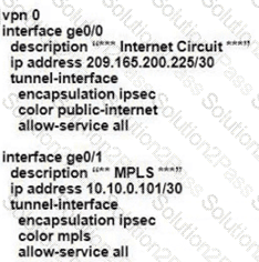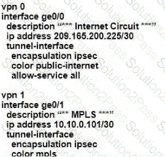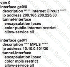 The network team must configure branch B WAN Edge device 103 to establish dynamic full-mesh IPsec tunnels between all colors with branches over MPLS and Internet circuits. The branch ts configured with: