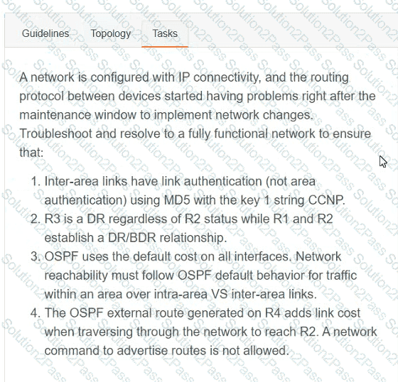 A network is configured with IP connectivity, and the routing protocol between devices started having problems right after the maintenance window to implement network changes. Troubleshoot and resolve to a fully functional network to ensure that: