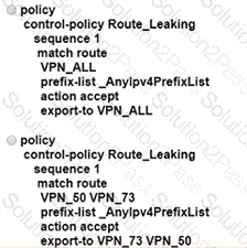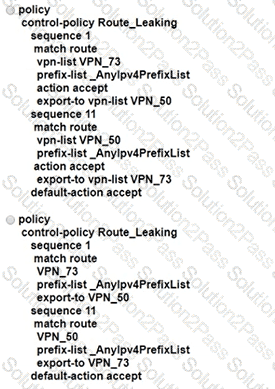An enterprise has several sites with multiple VPNs that are isolated from each other A new requirement came where users in VPN 73 must be able to talk to users in VPN 50 Which configuration meets this requirement?