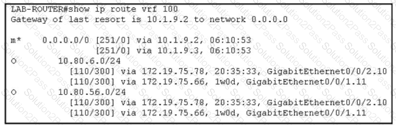 Refer to the exhibit. The network administrator has configured a centralized topology policy that results in the displayed routing table at a branch office. Which two configurations are verified by the output? [Choose two.)