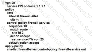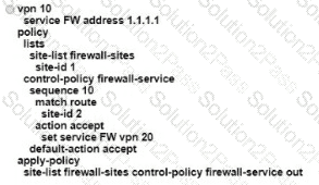 An engineer is configuring service chaining. Which set of configurations is required for all traffic from Site ID 1 going toward Site ID 2 to get filtered through the firewall on the hub site?