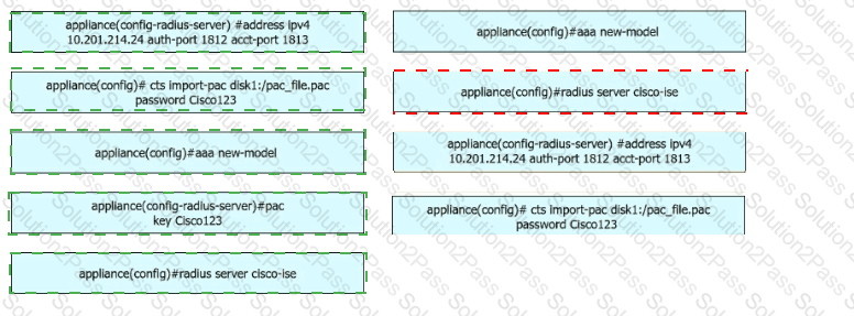 A security engineer configures a Cisco Catalyst switch to use Cisco TrustSec. The engineer must define the PAC key to authenticate the switch to Cisco IISE. Drag and drop the commands from the left into sequence on the right. Not all options are used.