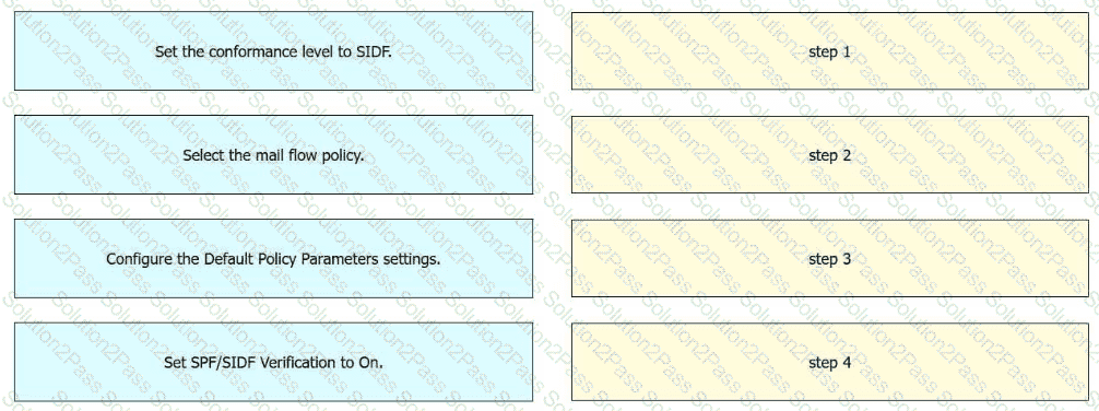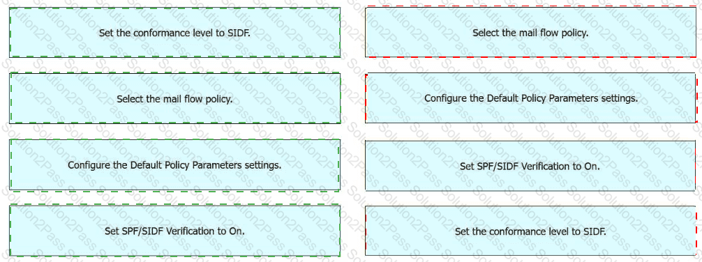 An engineer must enable SIDF for a mail flow policy on an incoming listener in Cisco Secure Email Gateway. Drag and drop the actions from the left into the sequence on the right to meet the requirement.