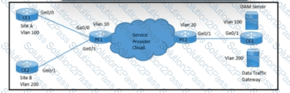 Refer to the exhibit. A network engineer with an employee ID: 5086:72:817 is configuring a connection to manage CE1 from the OAM server on VLAN 100. PE1 must push S-VLAN tag 10 toward PE2 while forwarding traffic from CE1 to the OAM server. PE1 must push S-VLAN tag 20 toward PE2 while forwarding traffic from CE2 to the data traffic gateway. Which configuration must the engineer implement on PE2?
