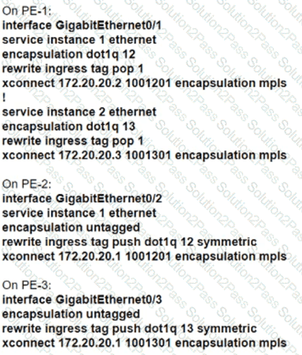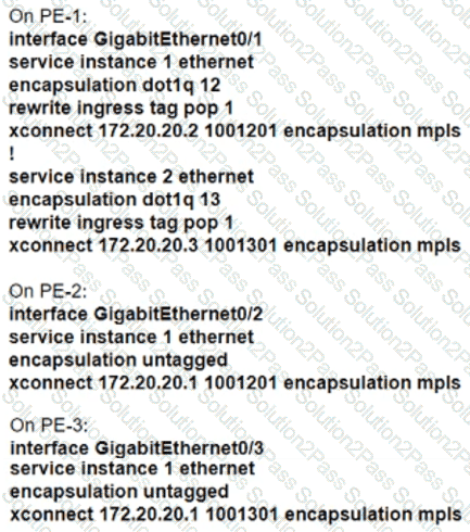 The customer that owns the CE-1, CE-2, and CE-3 routers purchased point-to-point E-Line services from the Carrier Ethernet provider. The service provider is delivering multiplexed UNI at the customer HQ location on PE-1 and untagged UNIs at the PE-2 and PE-3 locations. Additionally, the customer provided these VLAN to EVC mapping requirements: