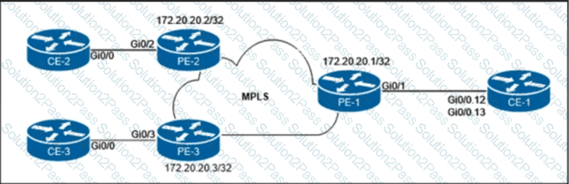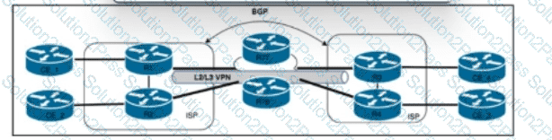 Refer to the exhibit. The four PE routers in the network are connected and running OSPF to share routes. MPLS is enabled on the four routers. The routers are connected and configured to use /30 networks. A network engineer must implement Layer 3 VPN support for traffic between customer sites.