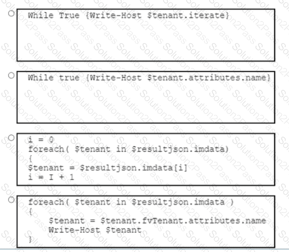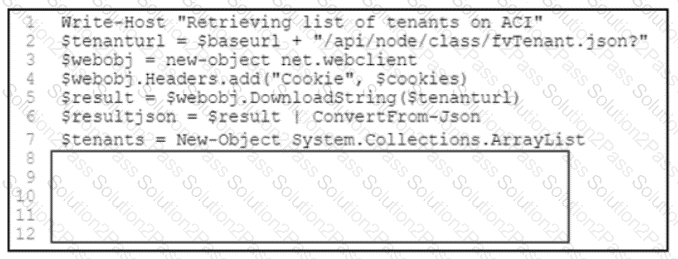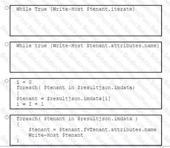 Refer to the exhibit. A DevOps engineer must create a PowerShell script to display a list of tenants in the Cisco Application Centric Infrastructure (ACI) by using the Cisco ACI PowerShell module. The engineer does NOT know how many results will be returned, so it is important to iterate through all the results. Which code snippet completes the script?