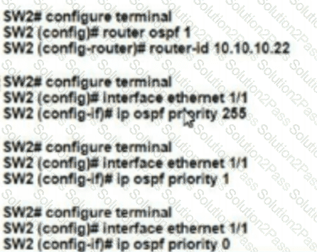 Refer to the exhibit. All switches are configured with the default OSPF piority.Which configuration should be applied to ensure that the SW2 Cisco Nexus switch controls the LSA floods and advertises the network to the remaining nodes m the OSPFv2 area?