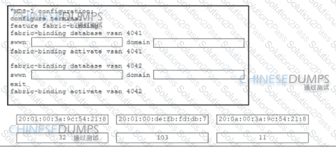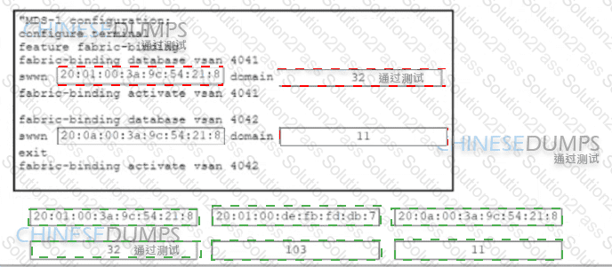 Refer to the exhibit The VSAN 4041 and 4042 are exchanged between two Cisco MDS 9000 Series Switches called MDS-1 and MDS-2 The objective is to deploy a security mechanism on MDS-1 to allow MDS-2 to join the fabric exclusively Drag and drop the code snippets from the bottom onto the boxes in the code to complete the MDS-1 configuration Not all code snippets are used.