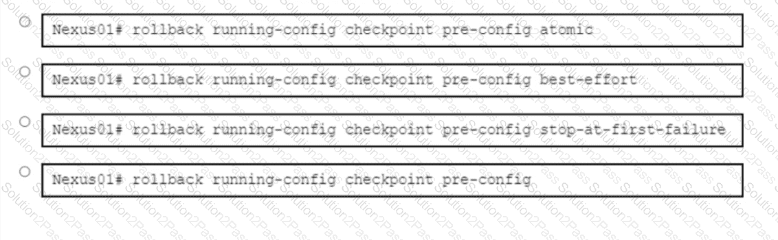 A network engineer must roll back a configuration change made on a Cisco Nexus 9300 Series Switch. Before the change, the network engineer created a checkpoint named pre-config. The rollback abort if any errors occur. Which command must be used to accomplish these objectives?