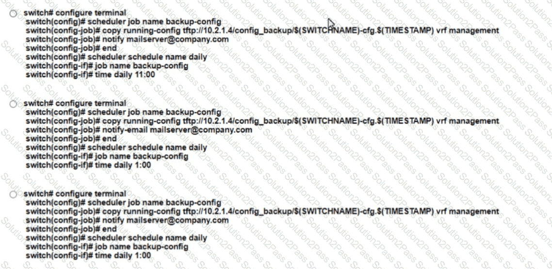 A network administrator must create a daily scheduler job on a Cisco Nexus 9000 Senes Switch to back up the device configuration and transfer the backed-up configuration to an external server The backup task must meet these requirements