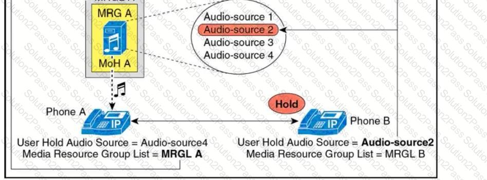 Refer to the exhibit There is a call flow between Phone A and Phone B Phone B (holder) places Phone A (holder) on hold Which MRGL and Audio Source are played to Phone A?