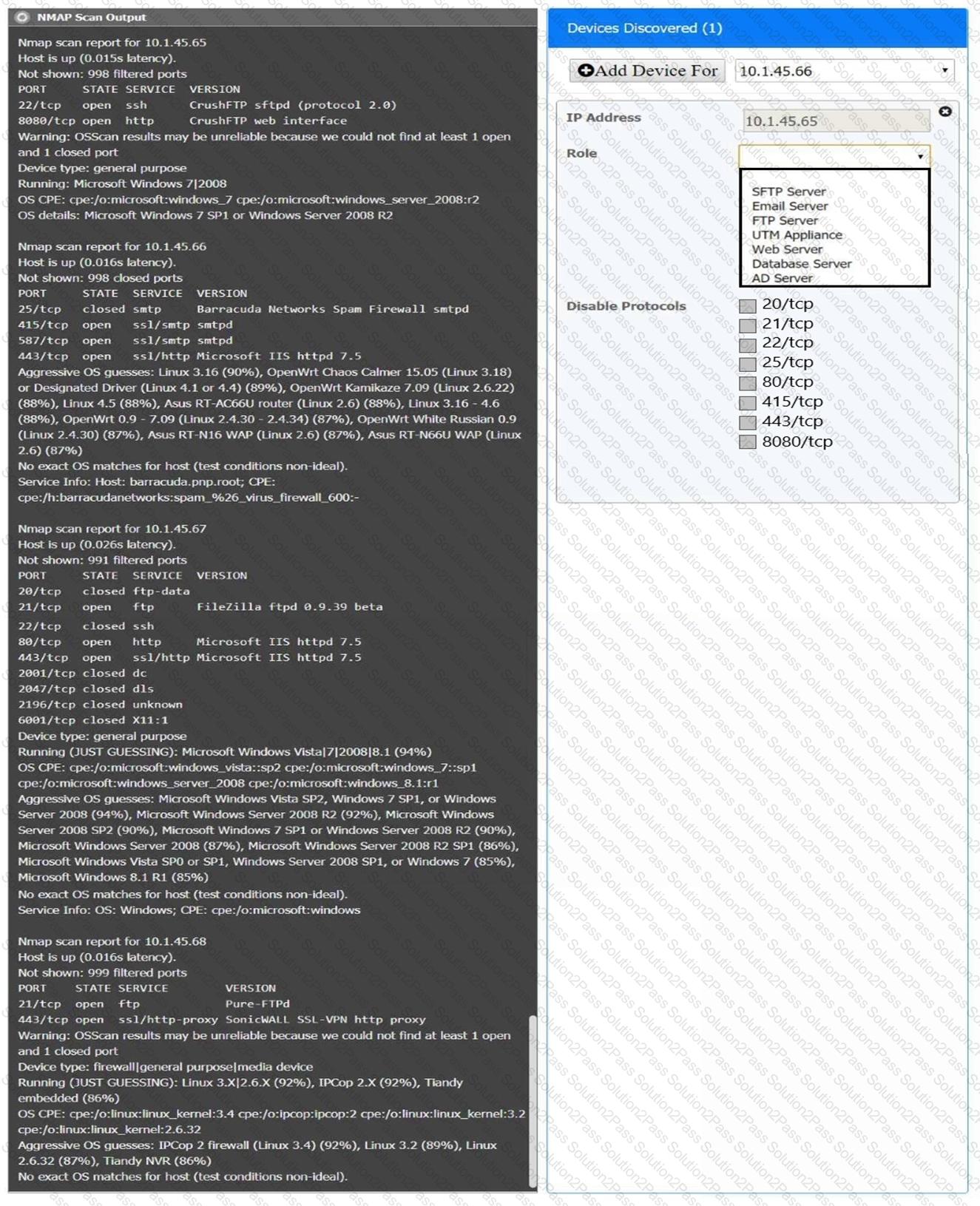 Using the Nmap output, identify the devices on the network and their roles, and any open ports that should be closed.