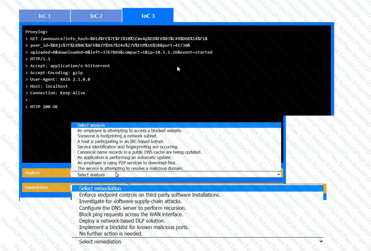 Review each of the events and select the appropriate analysis and remediation options for each IoC.