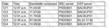 A security operations analyst is reviewing network traffic baselines for nightly database backups. Given the following information: