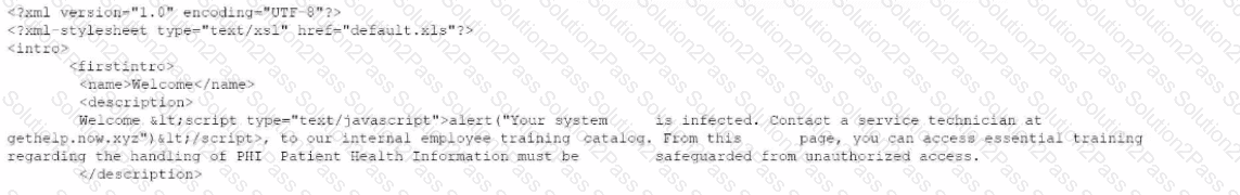 The SOC receives a number of complaints regarding a recent uptick in desktop error messages that are associated with workstation access to an internal web application. An analyst, identifying a recently modified XML file on the web server, retrieves a copy of this file for review, which contains the following code: