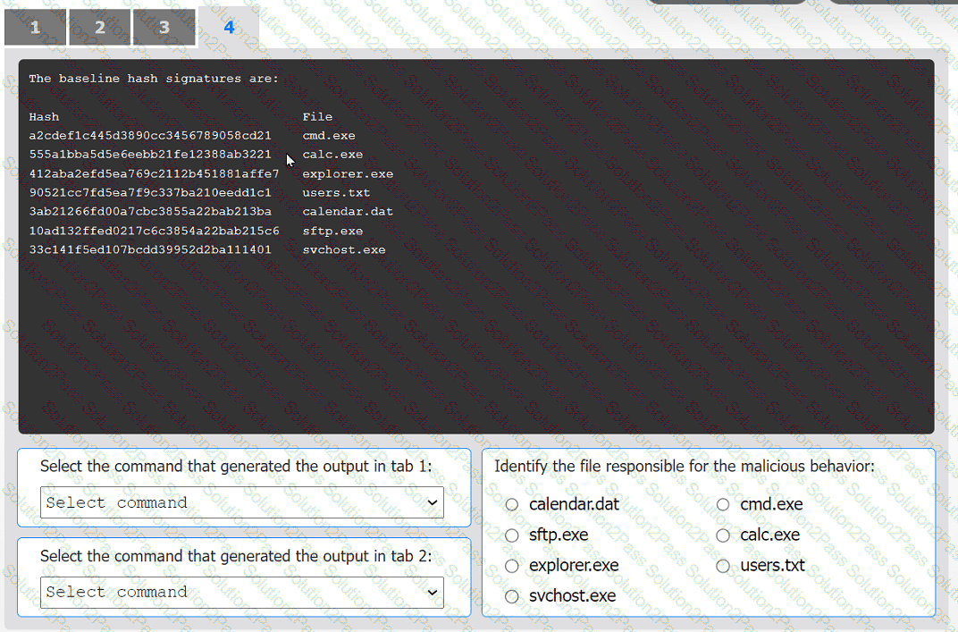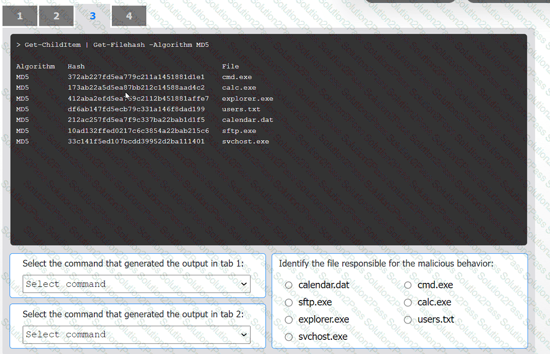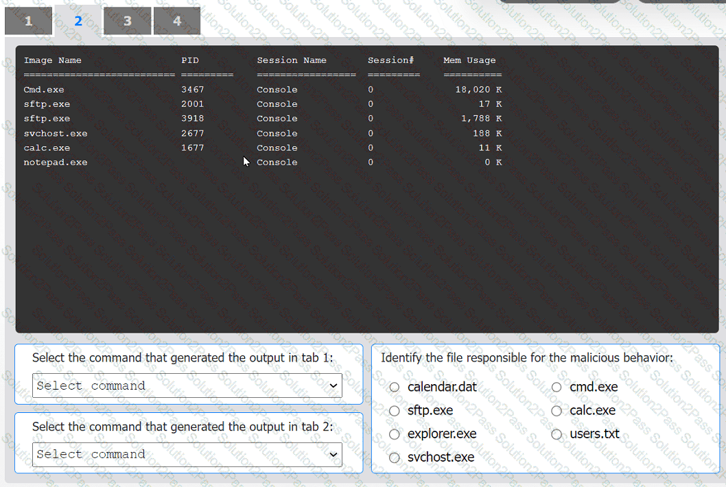 Review the output text in all tabs and identify the file responsible for the malicious