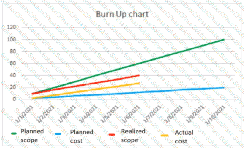 A project sponsor asked the PM to provide a summary of the current financial status. The PM uses the following burn up chart for the analysis: