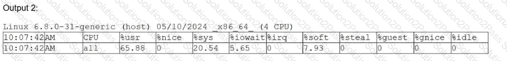 Users report that a Linux system is unresponsive and simple commands take too long to complete. The Linux administrator logs in to the system and sees the following: Output 1: