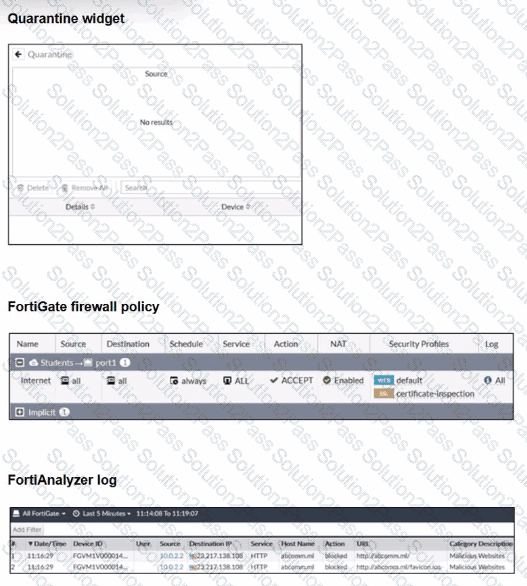 To test the setup, a device with the IP address 10.0.2.1 that is connected through a managed FortiSwitch attempts to access a malicious website. The logs on FortiAnalyzer confirm that the event was recorded, but the device does not appear in the FortiGate quarantine widget.
