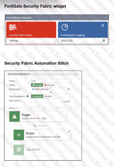 Security Fabhc quarantine automation has been configured to isolate compromised devices automatically. FortiAnalyzer has been added to the Security Fabric, and an automation stitch has been configured to quarantine compromised devices.